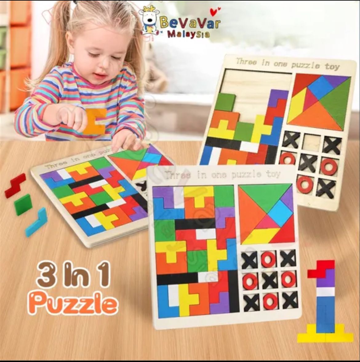 Here’s a long, detailed, and engaging description for your 3-in-1 Wooden Puzzle Game for Kids: