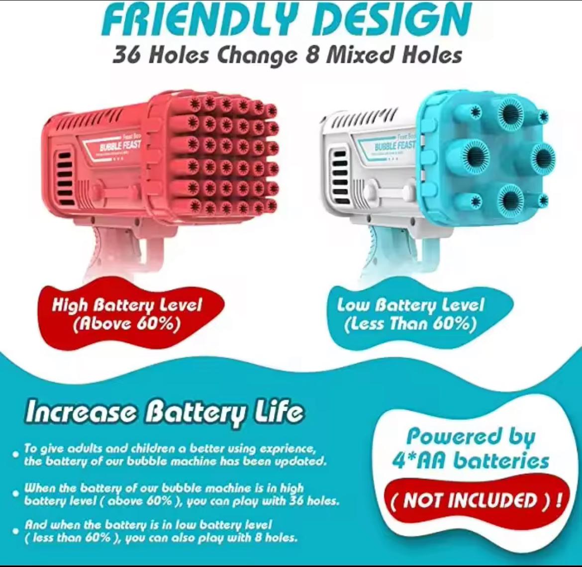 The Bubble Gun 32-Hole Machine is designed with precision to ensure a smooth, powerful, and consistent bubble flow. Simply dip the gun head into the included bubble liquid and press the button — within moments, you’ll have a continuous stream of bright, floating bubbles filling the air. The built-in motor works efficiently while staying quiet, making it enjoyable for children without startling them.