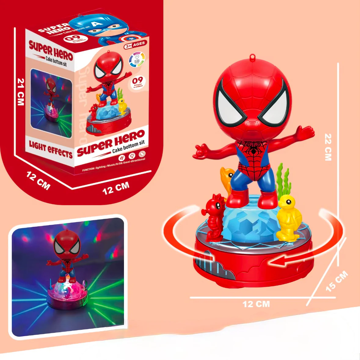 - Functions: 360° rotation, lights, and music
