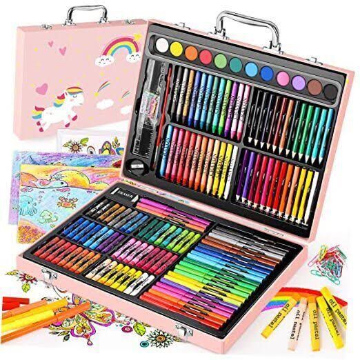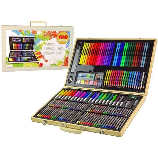 The Splendour 180 Pcs Premium Kids Drawing Art Set is a complete creative kit packed in a beautiful wooden storage box, perfect for young artists who love to explore their imagination. This all-in-one set includes colored pencils, crayons, oil pastels, watercolors, markers, paint brushes, and more, giving kids everything they need for sketching, coloring, and painting.